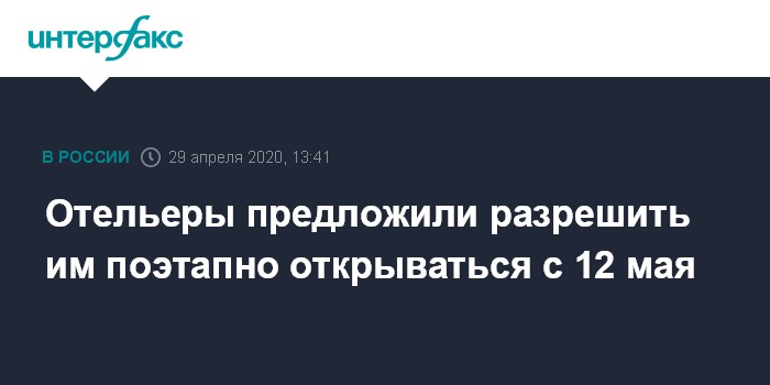 Москва. 29 апреля. INTERFAX.RU - После слов президента Владимира Путина о возможном начале ослабления ограничений в регионах с 12 мая отельеры предложили с этой даты разрешать им постепенно открывать гостиницы и рестораны. Об этом сообщили в Общенациональном союзе индустрии гостеприимства (ОСИГ).