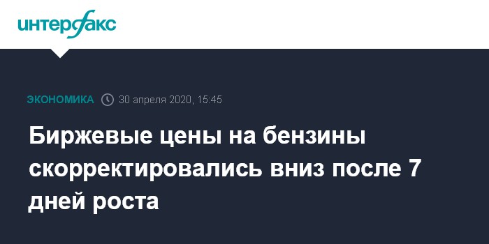 Москва. 30 апреля. INTERFAX.RU - Цены на бензины на Санкт-Петербургской международной товарно-сырьевой бирже (СПбМТСБ) в четверг скорректировались вниз на 2-3% после 7 дней безостановочного роста, однако за эти семь торговых дней скачок биржевых цен на бензин составил 10-12%.