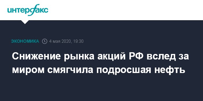 Москва. 4 мая. INTERFAX.RU - Рынок акций РФ начал неделю со снижения вслед за мировыми фондовыми площадками на вернувшихся опасениях возобновления торговой войны США и Китая; откат смягчила подросшая нефть на ожиданиях постепенного восстановления баланса на рынке.