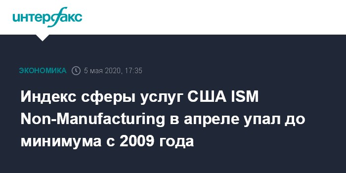Москва. 5 мая. INTERFAX.RU - Индекс деловой активности в сфере услуг США (ISM Non-Manufacturing) в апреле снизился до 41,8 пункта - минимума с апреля 2009 года, свидетельствуют данные Института управления поставками (ISM).