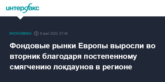 Москва. 6 мая. INTERFAX.RU - Европейские рынки акций выросли во вторник на фоне оптимизма трейдеров, связанного с постепенным смягчением ограничений, которые были введены с целью сдерживания распространения коронавирусной инфекции COVID-19, в государствах региона.