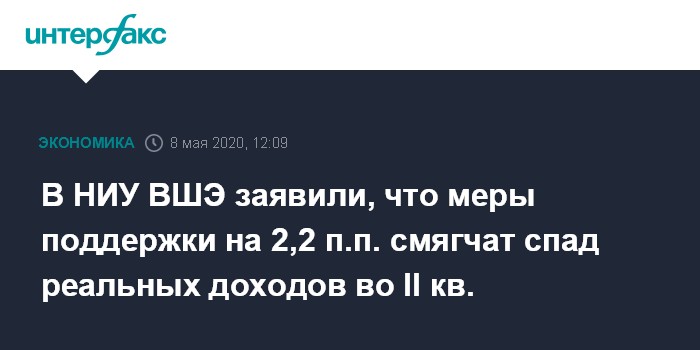 "В периоды кризисов политика государства является важным фактором, влияющим на динамику доходов населения. В 2009-2010 гг. негативные последствия для доходов удалось сгладить, повышая пенсии. После 2014 г. таких масштабных мер, смягчающих падение реальных располагаемых доходов, не принималось, и по итогам 2019 г. они оставались на 7,4% ниже уровня 2013 г. По нашим оценкам, без принятия антикризисных мер реальные располагаемые доходы населения могли бы составить во втором квартале 2020 г. 78,2% от их уровня во втором квартале 2019 г. Уже принятые меры поддержки повысят этот уровень на 2,2 п.п. В целом за год падение реальных доходов может составить от 8 до 12%", - говорится в обзоре ВШЭ.