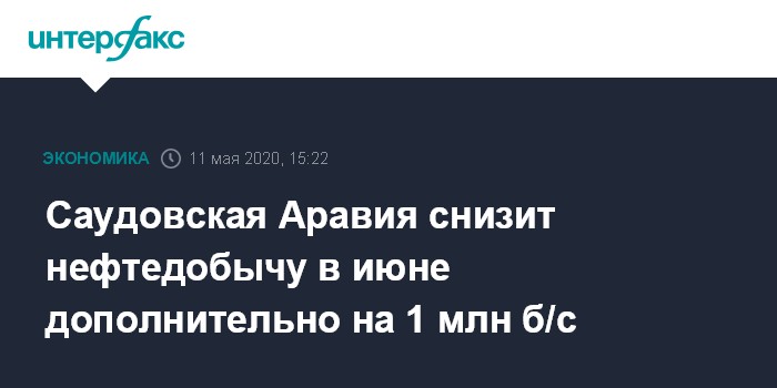 Москва. 11 мая. INTERFAX.RU - Министерство энергетики Саудовской Аравии приказало госкомпании Saudi Aramco снизить добычу нефти в июне еще на 1 млн баррелей в сутки в дополнение к обязательствам страны в рамках сделки ОПЕК+, заявило госагентство SPA.