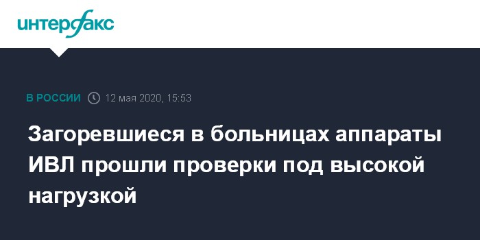 Москва. 12 мая. INTERFAX.RU - Аппараты ИВЛ "Авента", которые загорелись 9 и 12 мая в больницах, прошли все необходимые виды тестирования, в том числе под высокой нагрузкой, заявили в концерне "Радиоэлектронные технологии" (КРЭТ, входит в "Ростех". У компании есть документы о результатах исследований.