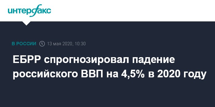 Москва. 13 мая. INTERFAX.RU - Европейский банк реконструкции и развития (ЕБРР) сразу на 6,2 п.п. ухудшил свой прогноз по динамике российской экономики в 2020 году. Теперь он ожидает ее сокращения на 4,5% против роста на 1,7% в предыдущей версии прогноза. Причинами названы последствия пандемии и ситуация на рынке нефти.