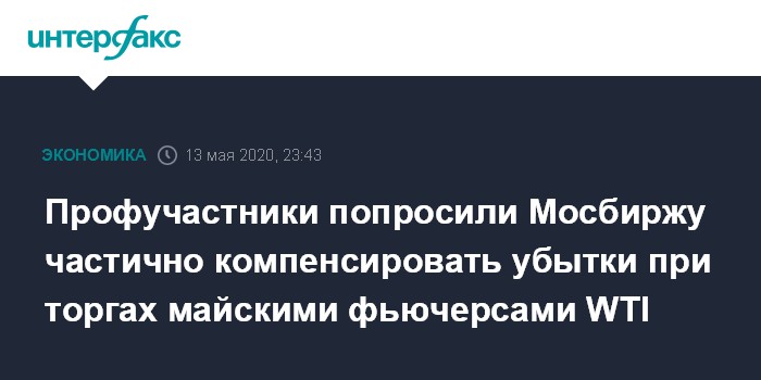 Москва. 13 мая. INTERFAX.RU - Национальная ассоциация участников фондового рынка (НАУФОР) направила в "Московскую биржу" письмо с просьбой рассмотреть вопрос о возможности участия биржи в реструктуризации убытков клиентов при торгах фьючерсами на нефть WTI в апреле 2020 года.