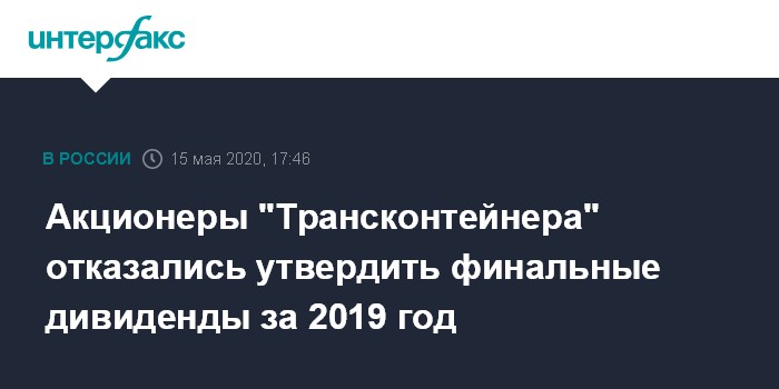 Москва. 15 мая. INTERFAX.RU - Акционеры ПАО "Трансконтейнер" на годовом заочном собрании проголосовали против выплаты финальных дивидендов за 2019 год. Пресс-служба оператора объяснила, что это решение связано с неопределенностью, вызванной пандемией, и высокой волатильностью глобального транспортного рынка.