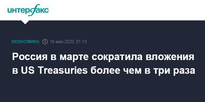 Москва. 16 мая. INTERFAX.RU - Россия сократила вложения в казначейские обязательства министерства финансов США в марте 2020 года на $8,732 миллиарда по сравнению с предыдущим месяцем.
