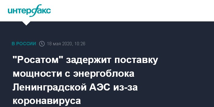 Москва. 18 мая. INTERFAX.RU - "Росатом" может задержать на два месяца, до 1 апреля 2021 года начало поставки мощности со II энергоблока Ленинградской АЭС-2 из-за коронавируса, пишет "Коммерсантъ". Госкорпорация попросила "Совет рынка" не штрафовать ее за срыв сроков и не брать с нее неустойку.