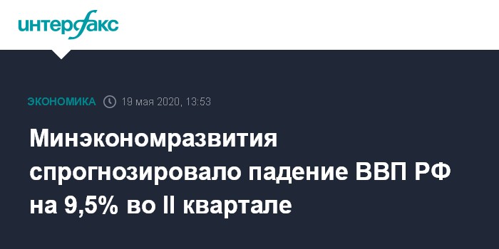 Москва. 19 мая. INTERFAX.RU - Во II квартале 2020 года, когда многие отрасли российской экономики по сути закрылись на карантин, падение ВВП может быть сопоставимо с антирекордами кризисов 1998 и 2008-2009 годов, считают в Минэкономразвития. Там ждут сокращения экономики не менее чем на 9,5% по сравнению со II кварталом 2019 года.