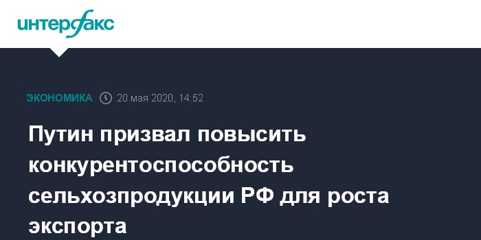 Москва. 20 мая. INTERFAX.RU - России нужно повышать конкурентоспособность агропромышленного комплекса, чтобы отечественные продовольственные товары пользовались растущим спросом за рубежом, считает президент РФ Владимир Путин.
