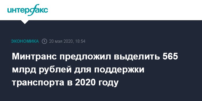 Москва. 20 мая. INTERFAX.RU - Минтранс предлагает внести в общенациональный план восстановления экономики и нормализации деловой жизни меры на 565 млрд рублей для поддержки всех видов транспорта в 2020 году, заявил министр транспорта РФ Евгений Дитрих на заседании рабочей группы "Единой России" по подготовке предложений в план.