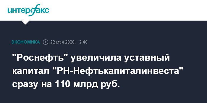 Москва. 22 мая. INTERFAX.RU - Уставный капитал дочерней компании "Роснефти" - ООО "РН-Нефтькапиталинвест" - увеличился сразу на 110 млрд рублей.