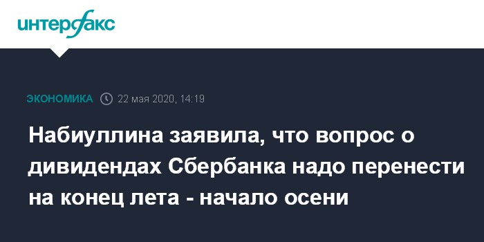 Москва. 22 мая. INTERFAX.RU - Вопрос о дивидендах Сбербанказа 2019 год надо перенести на конец августа - начало сентября, чтобы оценить потребность в капитале на фоне потерь из-за ситуации с распространением COVID-19, сообщила председатель Банка России Эльвира Набиуллина в ходе онлайн-конференции в пятницу.
