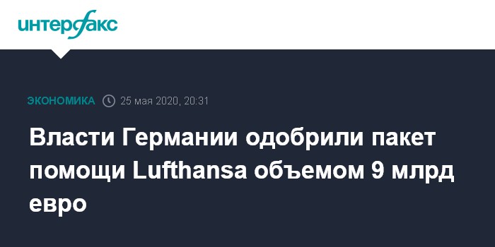 Москва. 25 мая. INTERFAX.RU - Deutsche Lufthansa AG получила одобрение правительства Германии на предоставление авиакомпании пакета финансовой помощи объемом до 9 млрд евро из государственного Фонда экономической стабильности (WSF).