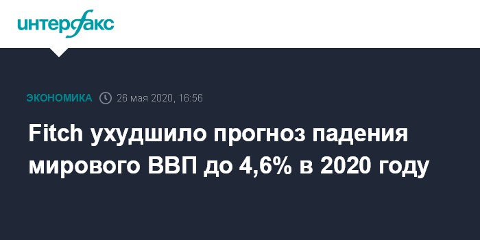 Москва. 26 мая. INTERFAX.RU - Международное рейтинговое агентство Fitch ухудшило прогноз падения мирового ВВП в текущем году до 4,6% по сравнению с ранее ожидавшимся снижением на 3,9%.