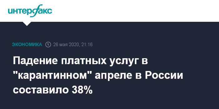 В апреле, как сообщил Росстат, объем платных услуг упал к тому же месяцу прошлого года на 37,9%, а к марту - на 33,6%. Накопленный результат за 4 месяца в результате апрельского провала - падение на 10,3%.