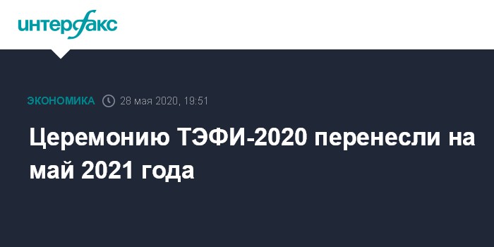 Москва. 28 мая. INTERFAX.RU - Церемония вручения телепремии ТЭФИ 2020 года из-за коронавируса перенесена на май 2021 года, сообщила пресс-секретарь Комитета индустриальных премий Наталья Уварова. Совет директоров комитета премии примет окончательное решение по дате в конце июня.
