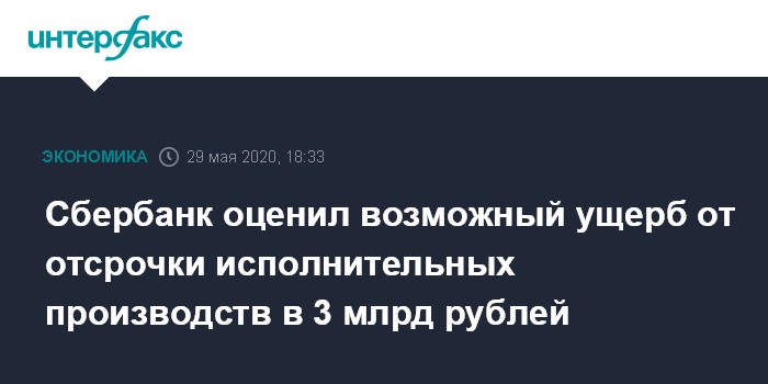 Москва. 29 мая. INTERFAX.RU - Сбербанк России оценил потенциальный ущерб от отсрочки исполнительных производств на полгода в сумму свыше 3 млрд рублей. Минэкономразвития предложило механизм доработать с учетом его влияния на финансовые показатели кредитных организаций. Об этом сообщил "Интерфаксу" источник в финансово-экономическом блоке правительства.
