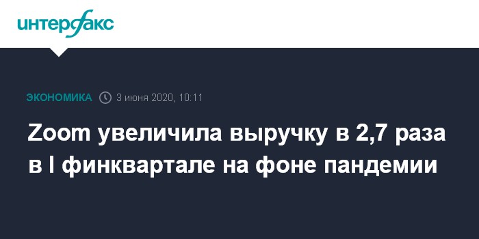 Москва. 3 июня. INTERFAX.RU - Американская Zoom Video Communications, предоставляющая услуги удаленной конференц-связи, в первом квартале 2020 финансового года увеличила выручку почти в 2,7 раза и улучшила прогноз на весь год.