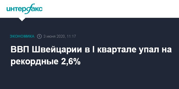 Москва. 3 июня. INTERFAX.RU - В I квартале 2020 года ВВП Швейцарии сократился впервые с четвертого квартала 2018 года, падение стало рекордным с начала ведения расчетов в 1980 году. В квартальном измерении ВВП сократился на 2,6%, сообщил Государственный секретариат по экономике (SECO). В IV экономика страны выросла на 0,3%.