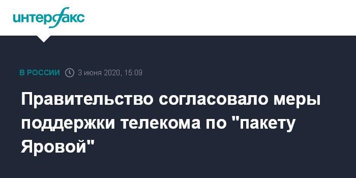 Москва. 3 июня. INTERFAX.RU - Правительство поддержало большую часть предложений Минкомсвязи по поддержке телеком-отрасли, в том числе годовую отсрочку на исполнение требований "пакета Яровой" по ежегодному увеличению емкости для хранения данных на 15%. Об этом на онлайн-конференции "Телекоммуникации: Now. Next. Beyond. Самоизоляция на высоких скоростях", организованной газетой "Ведомости", сообщил замглавы министерства Олег Иванов.