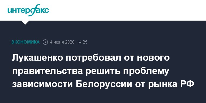 Москва. 4 июня. INTERFAX.RU - Президент Белоруссии Александр Лукашенко потребовал от нового состава правительства страны окончательно решить проблему зависимости республики от одного рынка - российского.