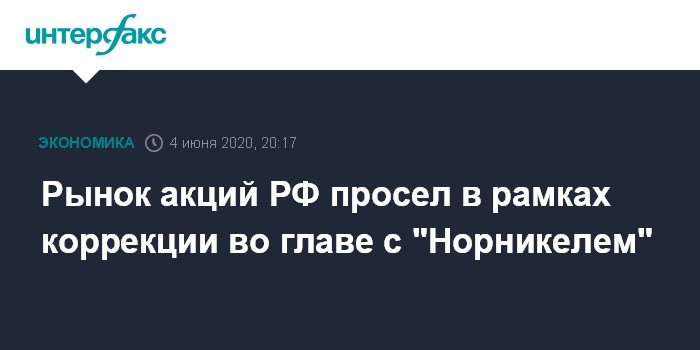 Москва. 4 июня. INTERFAX.RU - Рынок акций РФ в четверг просел в рамках коррекции из-за фиксации прибыли игроками на фоне приостановки общемирового ралли; лидерами отката выступили акции "Норникеля" из-за последствий аварии на ТЭЦ-3 "Норильско-Таймырской энергетической компании" ("дочка" "Норникеля"). Фаворитами дня стали акции АФК "Система" и взлетевшие бумаги "Мечела" на новостях о выкупе бумаг с премией к рынку.