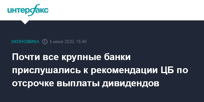 ЦБ в начале апреля рекомендовал финансовым организациям назначать годовые собрания, где планируется принять решения о выплате дивидендов за 2019 год, на конец августа - сентябрь 2020 года. Тем организациям, которые уже назначили годовое собрание на дату до 30 июня, регулятор предложил рассмотреть возможность изменения срока его проведения.