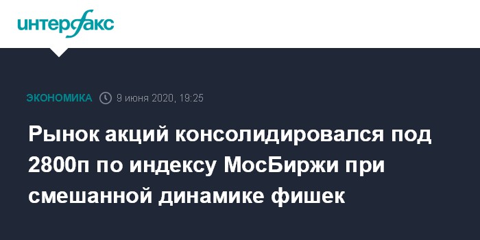 Москва. 9 июня. INTERFAX.RU - Рынок акций РФ во вторник консолидировался при смешанной динамике "фишек" на фоне просадки мировых фондовых площадок после ралли, а также удержавшейся от ощутимой коррекции нефти Brent; индекс МосБиржи остался на пороге рубежа 2800 пунктов, при этом лидерами отката выступили ранее перегретые акции "Аэрофлота".