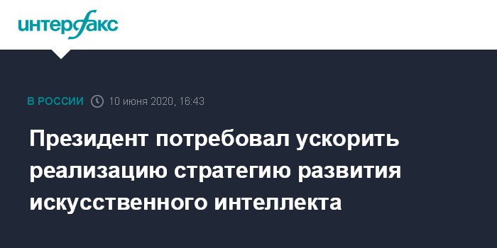 Москва. 10 июня. INTERFAX.RU - Президент Владимир Путин поручил правительству ускорить подготовку пошагового плана реализации утвержденной в 2019 году стратегии развития искусственного интеллекта. Он сказал это на на совещании по вопросам развития IT-отрасли.