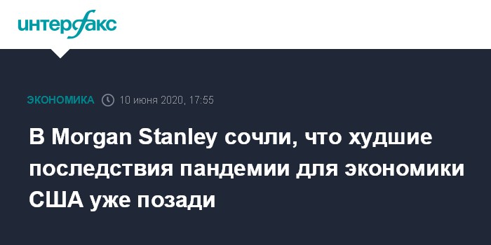 Москва. 10 июня. INTERFAX.RU - Худшие времена для экономики США, оказавшейся в кризисе из-за пандемии коронавирусной инфекции COVID-19, уже позади, полагает главный исполнительный директор американского банка Morgan Stanley Джеймс Горман.