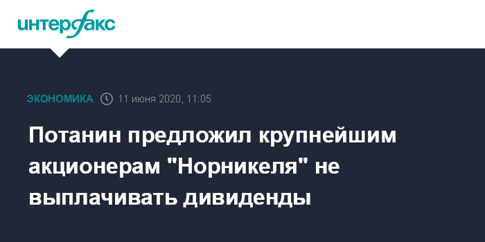 Москва. 11 июня. INTERFAX.RU - Глава и крупнейший акционер "Норильского никеля" Владимир Потанин предложил партнерам по акционерному соглашению "РусАлу" и Crispian отказаться от выплаты дивидендов в 2020 году, так как произошедшая в конце мая авария в Норильске может оказать существенное влияние на финансовые показатели компании, сообщил "Интерфаксу" источник, знакомый с инициативой Потанина.