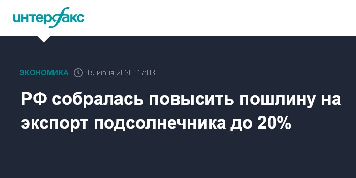 Москва. 15 июня. INTERFAX.RU - Россия с февраля 2021 года планирует повысить экспортную пошлину на подсолнечник до 20%, но не менее 80 евро за тонну, с нынешних 6,5%, но не менее 9,75 евро за тонну.