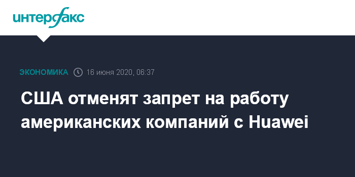 Москва. 16 июня. INTERFAX.RU - Министерство торговли США подтвердило, что отменит наложенные ранее ограничения на сотрудничество американских компаний с китайской Huawei в области создания системы связи 5G.