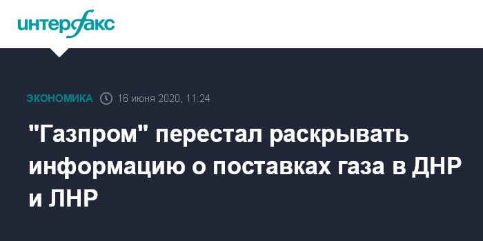 Москва. 16 июня. INTERFAX.RU - "Газпром" впервые прекратил раскрывать информацию об объемах поставок газа в самопровозглашенные республики Донбасса ДНР и ЛНР, пишет во вторник "Коммерсантъ", анализируя отчетность российской компании; издание полагает, что монополия нашла новую юридическую схему для снабжения газом ДНР и ЛНР.