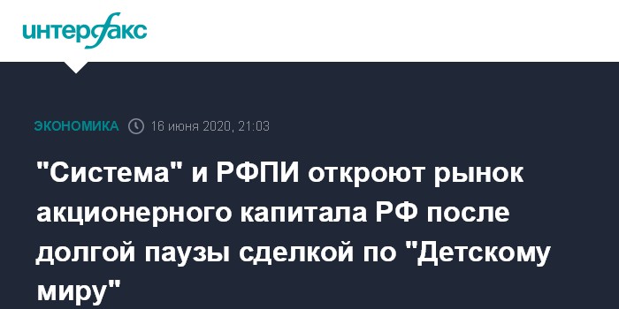 Москва. 16 июня. INTERFAX.RU - АФК "Система" (AFKS) и Российско-китайский инвестиционный фонд (учрежден Российским фондом прямых инвестиций и China Investment Corporation) проводят очередное размещение части своих пакетов в "Детском мире" в рамках процедуры ускоренного букбилдинга. Это первая сделка с начала года на российском рынке акционерного капитала, который на протяжении нескольких месяцев фактически был закрыт на фоне волатильности в связи с пандемией коронавируса.