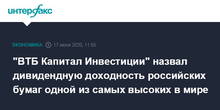 Москва. 17 июня. INTERFAX.RU - Дивидендная доходность российских акций остается одной из самых высоких в мире, в среднем по индексу Мосбиржи в этом году она может достичь 8%, сообщили аналитики "ВТБ Капитал Инвестиции" в ходе онлайн-конференции.