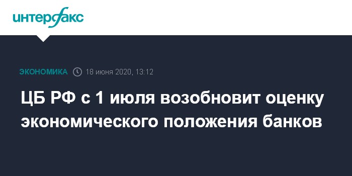 Москва. 18 июня. INTERFAX.RU - ЦБ РФ с 1 июля возобновит оценку экономического положения банков, сообщила зампред Банка России Ольга Полякова в ходе ежегодного съезда Ассоциации российских банков (АРБ), который проходит в онлайн-режиме.