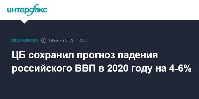 Москва. 19 июня. INTERFAX.RU - ЦБ РФ сохраняет прогноз падения ВВП РФ в 2020 году на 4-6%, отмечая что во II квартале спад может оказаться более глубоким, чем изначально ожидалось, говорится сообщении регулятора, опубликованном по итогам заседания совета директоров, на котором он понизил ключевую ставку до 4,5% с 5,5%.