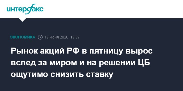 Москва. 19 июня. INTERFAX.RU - Рынок акций РФ к вечеру в пятницу вырос вслед за мировыми площадками и нефтью, а также на фоне решения ЦБ РФ снизить ключевую ставку сразу на 100 базисных пунктов (до 4,5% годовых); неделя также завершилась подъемом индексов.