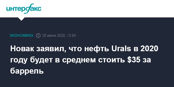 Москва. 20 июня. INTERFAX.RU - Минэнерго РФ ожидает, что средняя цена российской нефти марки Urals в 2020 году составит $35 за баррель, сообщил в интервью Handelsblatt глава ведомства Александр Новак.