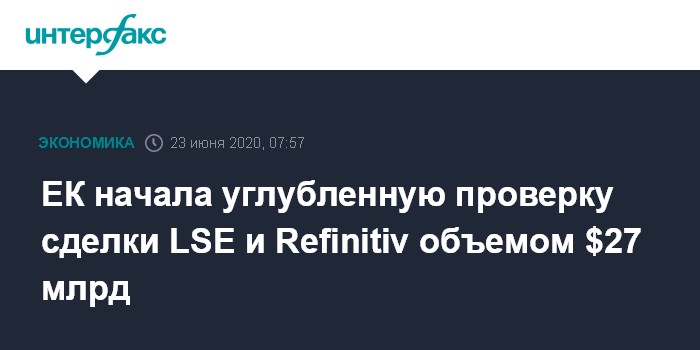 Москва. 23 июня. INTERFAX.RU - Европейская комиссия (ЕК) начала углубленную проверку сделки по покупке оператором Лондонской фондовой биржи London Stock Exchange Group (LSEG) одного из крупнейших мировых поставщиков финансовой информации Refinitiv Holdings Ltd.