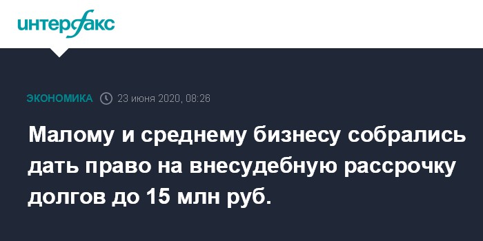 Москва. 23 июня. INTERFAX.RU - Субъекты малого и среднего предпринимательства (МСП) и индивидуальные предприниматели (ИП), наиболее пострадавшие от пандемии COVID-19, но не подпавшие под действие моратория на банкротство, смогут однократно воспользоваться ограниченной внесудебной рассрочкой на оплату долгов.