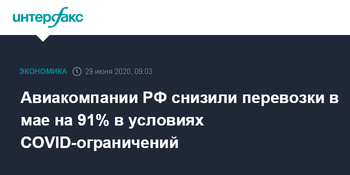 Москва. 29 июня. INTERFAX.RU - Авиакомпании РФ в условиях ограничений из-за COVID-19 снизили перевозки в мае 2020 года на 91,3% относительно аналогичного периода прошлого года, до 949 тысяч человек, сообщила Росавиация в понедельник.