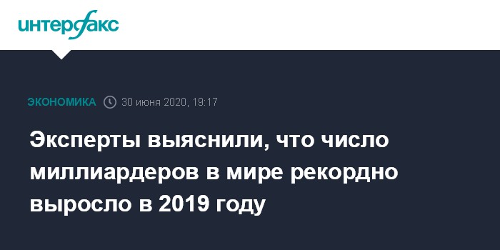 Москва. 30 июня. INTERFAX.RU - Число миллиардеров в мире и общая стоимость их состояний в 2019 году значительно выросли после сокращения годом ранее, достигнув рекордных показателей, свидетельствуют данные аналитической компании Wealth-X.
