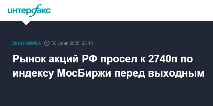 Москва. 30 июня. INTERFAX.RU - Рынок акций РФ во вторник просел вслед за нефтью, индекс МосБиржи опустился в район 2740 пунктов, причем откат сдерживался ослаблением рубля; взлетели бумаги Polymetal вслед за золотом, выросли акции "Новолипецкого металлургического комбината" и ПАО "Центральный телеграф" на дивидендных новостях; упали акции Petropavlovsk из-за корпоративного конфликта.