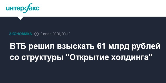 ВТБ решил взыскать 61 млрд рублей со структуры "Открытие холдинга"