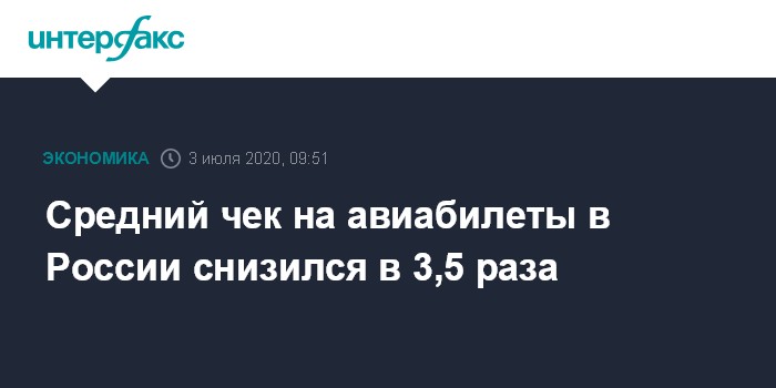 Москва. 3 июля. INTERFAX.RU - В России средний чек на покупку авиабилетов в период с 10 по 22 июня составил 3 437 рублей, что в 3,5 раза ниже, чем в феврале и марте - до введения связанных с коронавирусом ограничений авиасообщения с другими странами, сообщает в пятницу пресс-служба ВТБ.