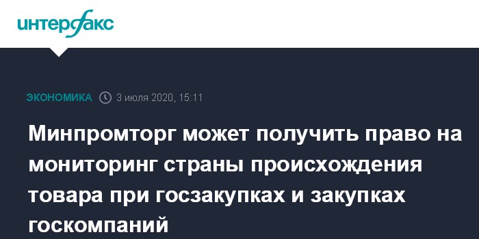 Москва. 3 июля. INTERFAX.RU - Минпромторг РФ может получить полномочия на осуществление мониторинга страны происхождения товаров при проведении госзакупок и закупок госкомпаний, сообщил "Интерфаксу" источник, знакомый с положениями двух законопроектов, направленных на рассмотрение правительства РФ.